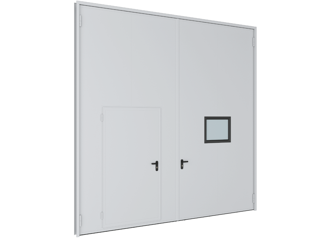 | Две створки поставляются в сборе (сэндвич-панели толщиной 80 мм, стальные окантовочные профили, усиливающие уголки, петли со сменной осью, уплотнитель, ригельная задвижка, механический замок). |
